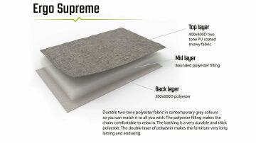 Oturak ve sırtlık çabuk kuruyan polyester malzemeden yapılmıştır. Dolgu, yüksek kullanım konforu ve iyi yalıtım sağlayan ek bir köpük tabakasına sahiptir.